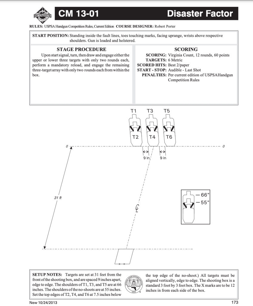 - Starting position is facing uprange with wrists above shoulders, on the buzzer turn and engage the bottom targets with 2 rounds each, reload, and engage the top targets targets with 2 rounds each